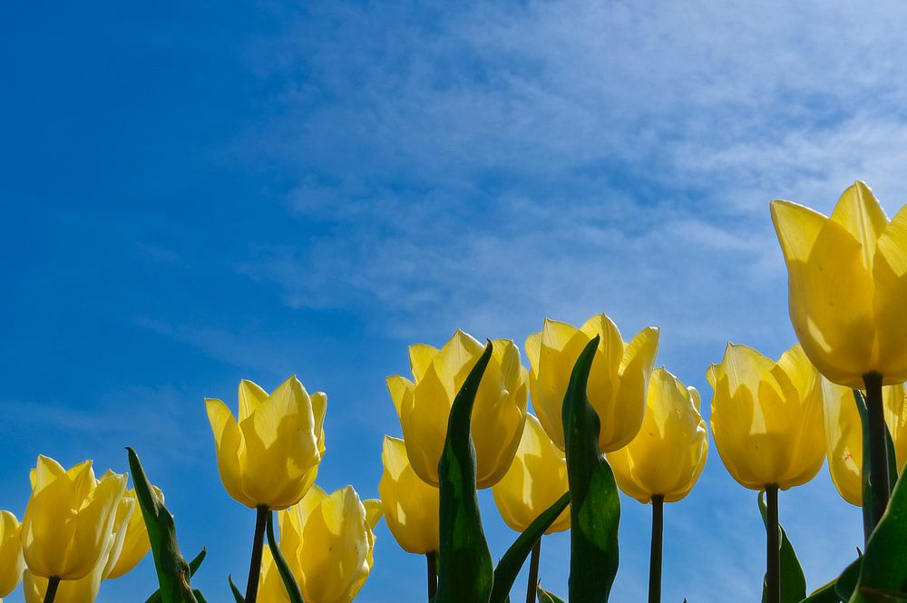 Die gelben Tulpen bilden einen schönen Kontrast zum blauen Himmel mit der Sonne außerhalb des Bildes.