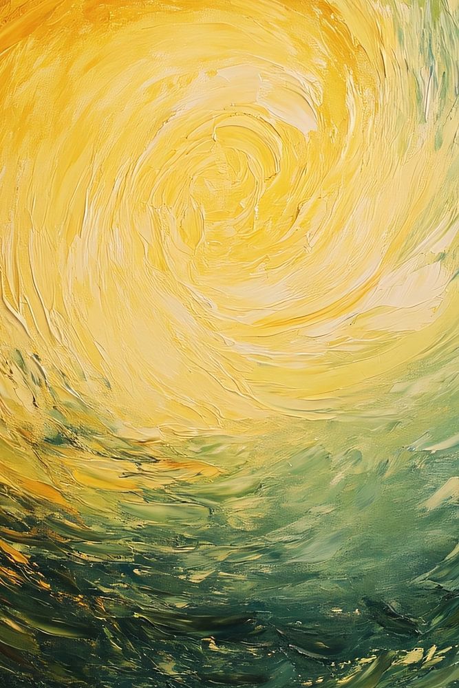 Dieses lebendige Design zeigt einen dynamischen Wirbel aus Gelb- und Grüntönen, der ein Gefühl von Bewegung und Energie hervorruft. Die Textur der Pinselstriche verleiht dem Kunstwerk eine spürbare Tiefe, während die Farben eine warme und beruhigende Atmosphäre schaffen. Das Bild scheint mit Licht und Schatten zu spielen, wobei die gelben Töne wie Sonnenlicht leuchten, das durch eine grüne Umgebung bricht. Dieses abstrakte Kunstwerk passt perfekt in eine moderne Einrichtung und könnte ein beeindruckender Blickpunkt in einem Wohnzimmer oder Büro sein. Die harmonischen Farben und die Bewegung im Design können inspirieren und Ruhe bringen.