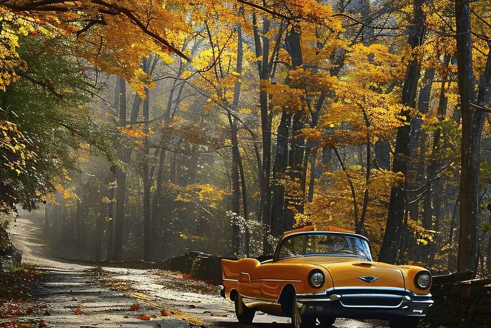 Entfliehen Sie in die Stille der Natur mit diesem schönen Bild eines Autos, das durch einen Wald fährt. Perfekt für die Wand Ihres Schlaf- oder Wohnzimmers.
