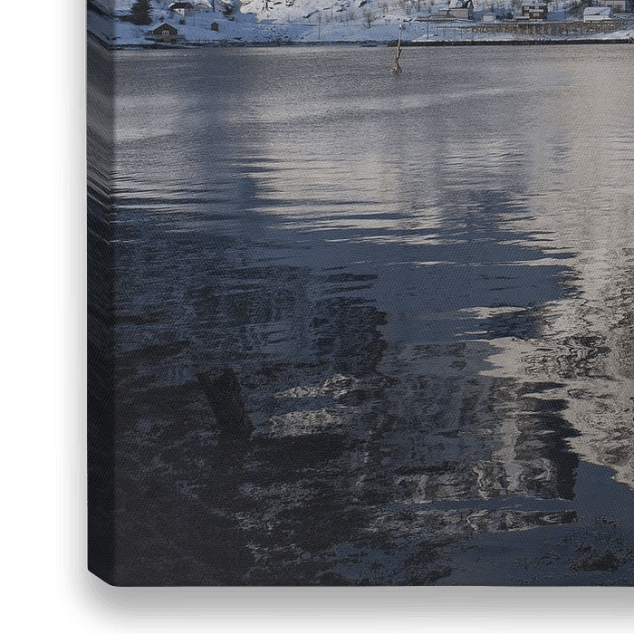 Hervorragendes Bild eines fast flachen Fjords mit einem gelben Boot. Die schneebedeckten Berge und die Spiegelung auf dem Wasser vervollständigen das Bild! Eine beruhigende Szene.