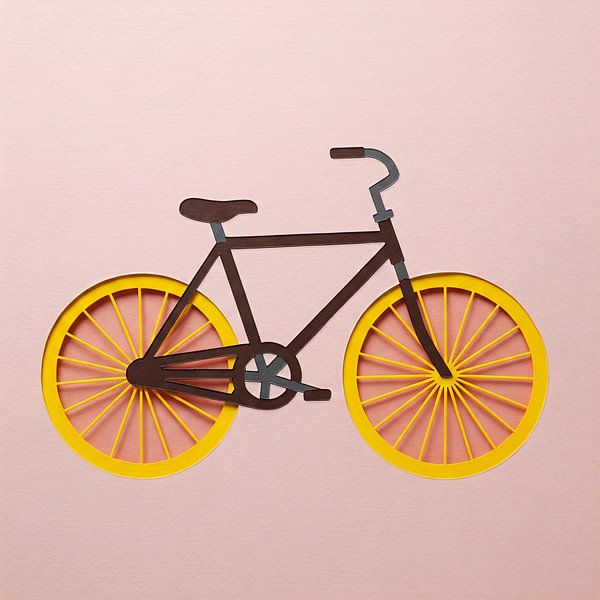Minimalistisches und fröhliches Scherenschnitt-Design eines Fahrrads auf einem pastellfarbenen Hintergrund. Ein perfektes Wandbild für Radfahrer.
