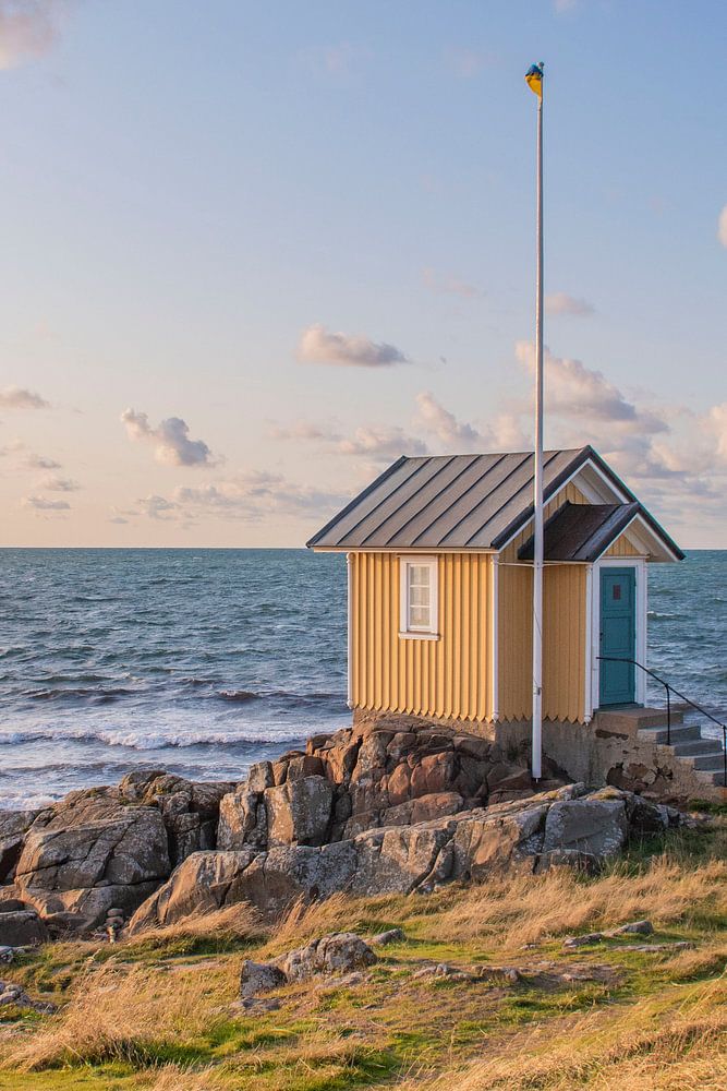 Gelbe Fischerhütte am Meer in Südschweden. Foto aufgenommen während des Sonnenuntergangs in Skäne