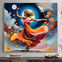 Ein schönes Gemälde, das eine tanzende Frau mit Blumen und viel Farbe darstellt.