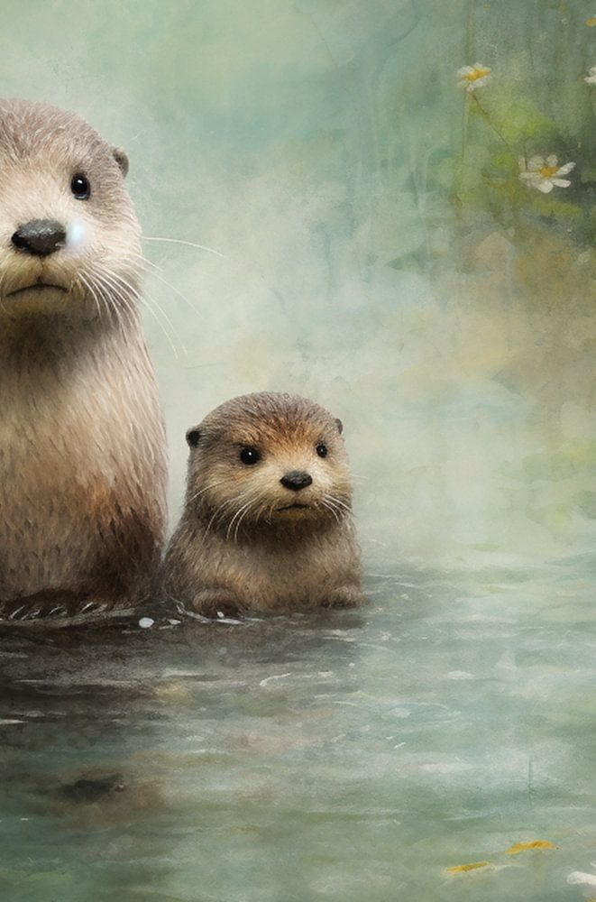 Zwei Otter - ein älterer und ein junger - tummeln sich gemeinsam im ruhigen Wasser, während im Hintergrund Gänseblümchen sanft vor sich hin dümpeln. Zusammen im Wasser fängt einen zarten Moment des Schutzes und der Nähe ein. Der verträumte Malstil, die sanften Farben und die subtilen Lichtreflexe machen es zu einem heiteren und herzerwärmenden Werk.
