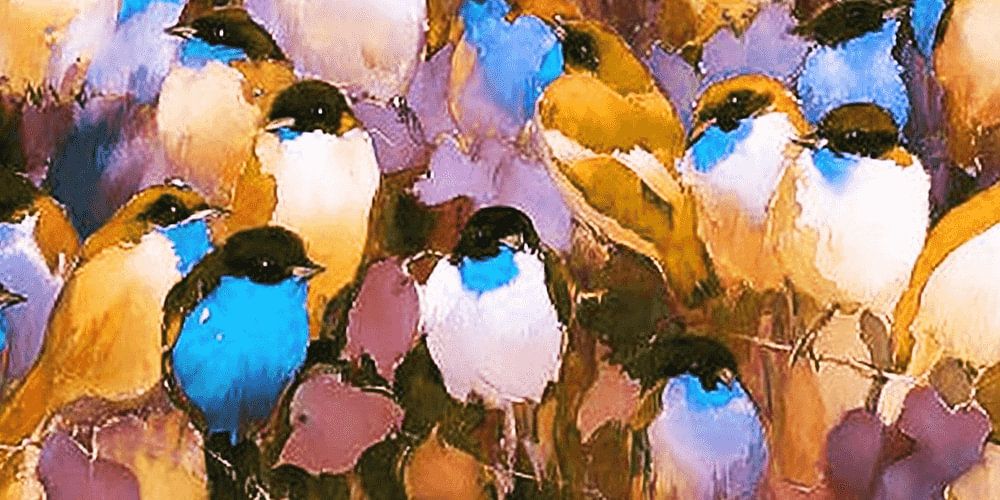 In dieser fröhlichen Szene bilden Dutzende von bunten Vögeln eine lebendige Gemeinschaft, die sich wie Musiker in einem fröhlichen Orchester aus Farben zusammenfinden. Orange, Blau, Weiß und Braun tanzen in lockeren, spontanen Pinselstrichen über die Leinwand.