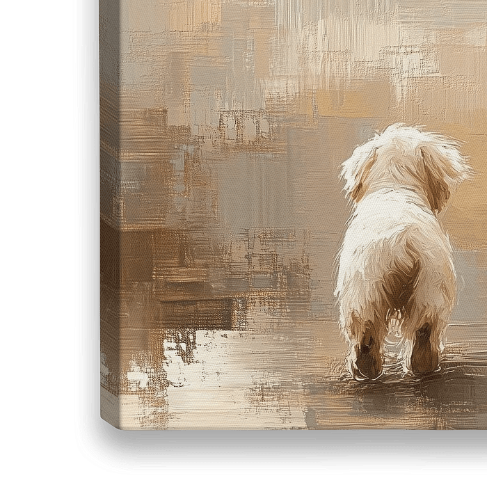 Das Kunstwerk zeigt ein kleines Mädchen, das mit seinem Hund spazieren geht. Der Hintergrund ist ein abstraktes Beige mit einer weichen Textur. Der Malstil zeichnet sich durch grobe Pinselstriche in warmen Tönen aus. Die Komposition unterstreicht die Interaktion der beiden in einer fröhlichen Atmosphäre.
