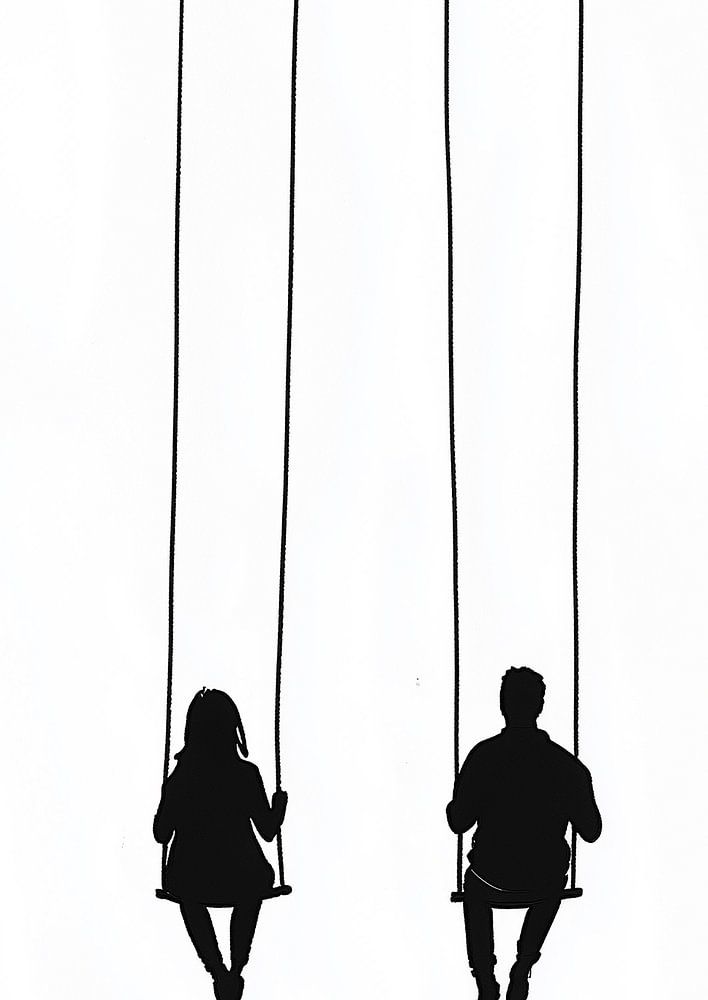 Eine minimalistische Strichzeichnung, ausgeführt in schwarzer Tinte auf ganz weißem Hintergrund, zeigt zwei Personen, die zusammen auf der Schaukel sitzen. Lange, dünne Seile hängen anmutig von der Schaukel herab, während die Figuren mit einfachen Formen und Linien gezeichnet sind. Mit minimalen Details schafft es diese Zeichnung dennoch, durch ihre elegante und spielerische Komposition ein Gefühl der Verbundenheit und Freude zu vermitteln. Die Einfachheit der Linien und Formen unterstreicht die Reinheit des Augenblicks und verleiht der Zeichnung eine heitere und zeitlose Ausstrahlung.