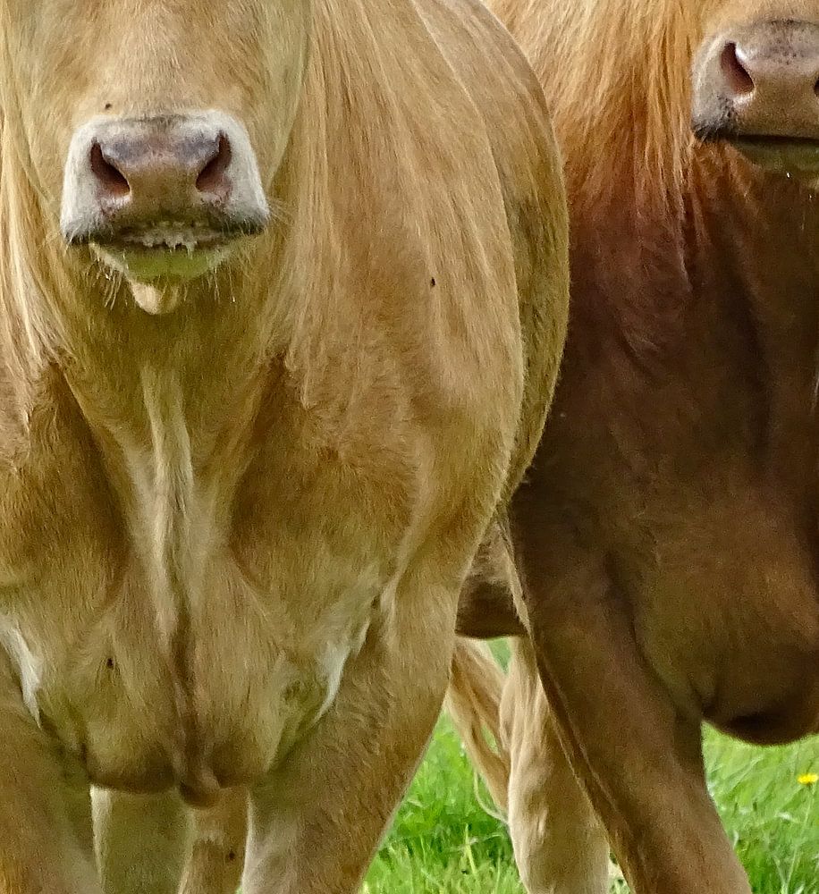 Braune., eine helle und eine dunkle, Kühe (Limousin) auf der grünen Wiese an der Hemrik