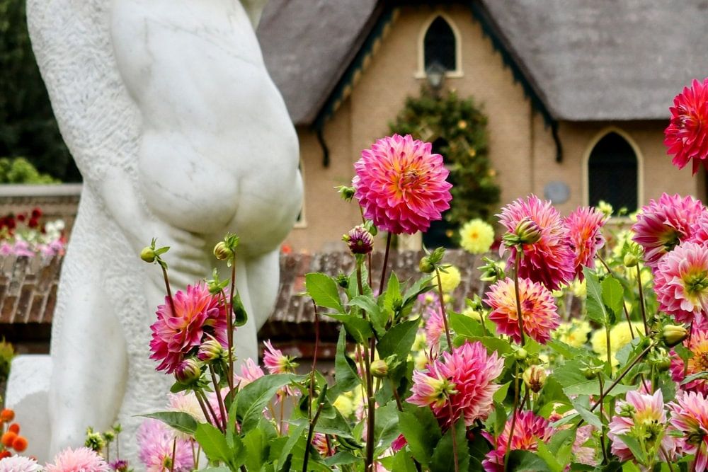Bunte Dahlienmischung vor einer Steinskulptur im Skulpturengarten von Schloss Keukenhof in der Nähe des Entenhauses