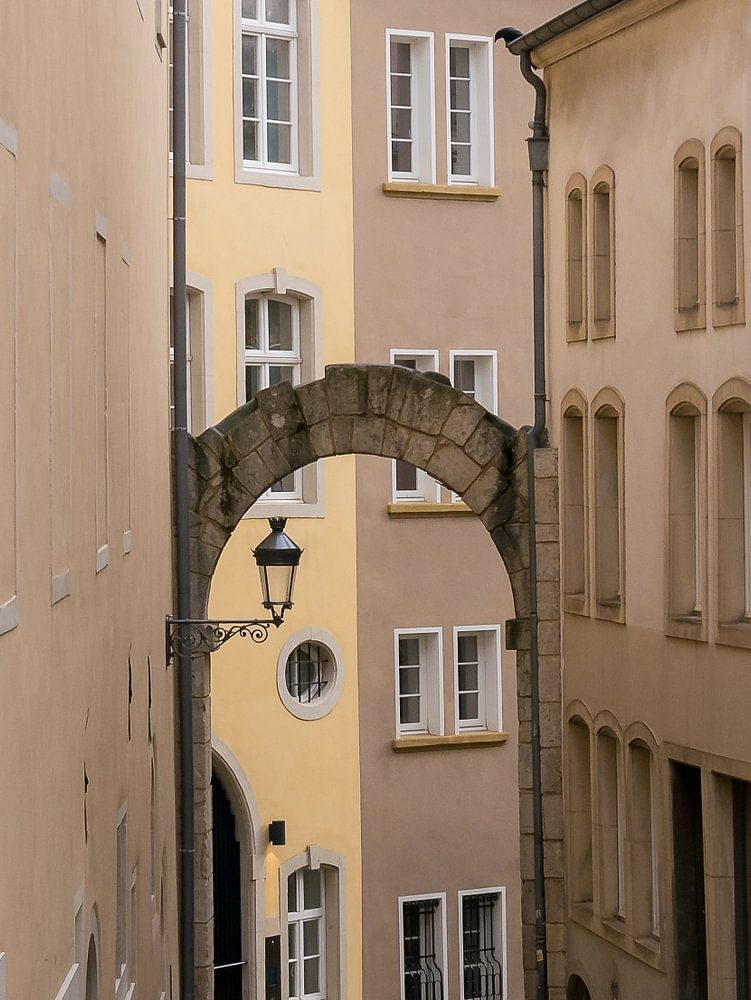 Eine der vielen stimmungsvollen Gassen, die Sie bei der Erkundung von Luxemburg-Stadt antreffen werden. In der Stadt werden Sie viele dieser Gassen und Gebäude mit wunderschöner, verschnörkelter Architektur und Farben sehen.