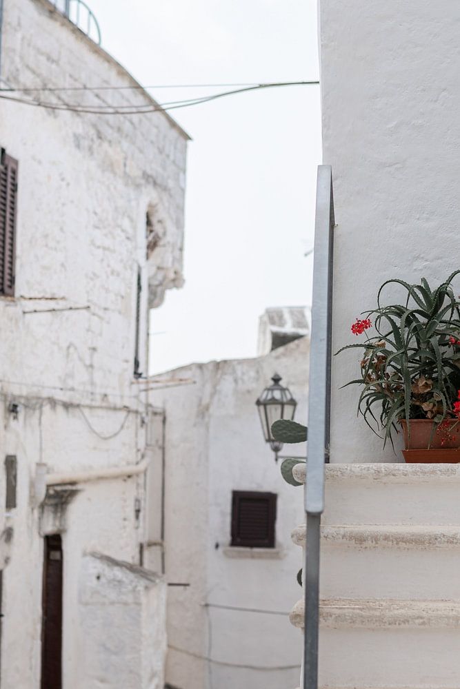 Entdecken Sie die antiken Details der weißen Stadt Ostuni. Sorgen Sie dafür, dass die Häuser voneinander getrennt sind und an jeder Straßenecke eine Pflanze steht.
