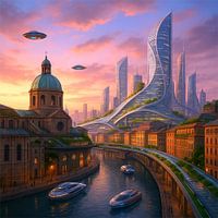 Dieses beeindruckende digitale Poster zeigt eine visionäre Neuinterpretation der historischen italienischen Hafenstadt Genua – ein meisterhaftes Zusammenspiel aus Vergangenheit, Gegenwart und Zukunft. Im Zentrum steht die klassisch anmutende Basilika mit ihrer grün…