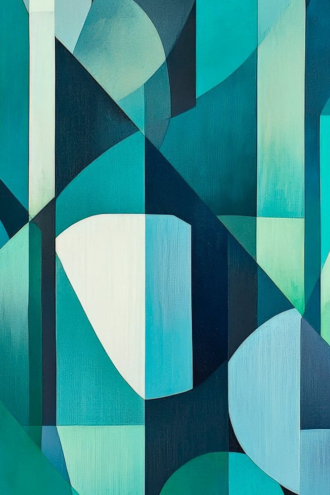 In sanften, kühlen Grüntönen und geometrischen Formen entfaltet sich eine faszinierende Komposition, die an eine moderne Stadtlandschaft erinnert. Die harmonischen Linien und kräftigen Kreise verleihen dem Raum eine zeitgenössische Eleganz. Ideal für das Wohnzimmer, lädt dieses Kunstwerk dazu ein, den Blick zu verweilen und das Gespräch zu beleben.