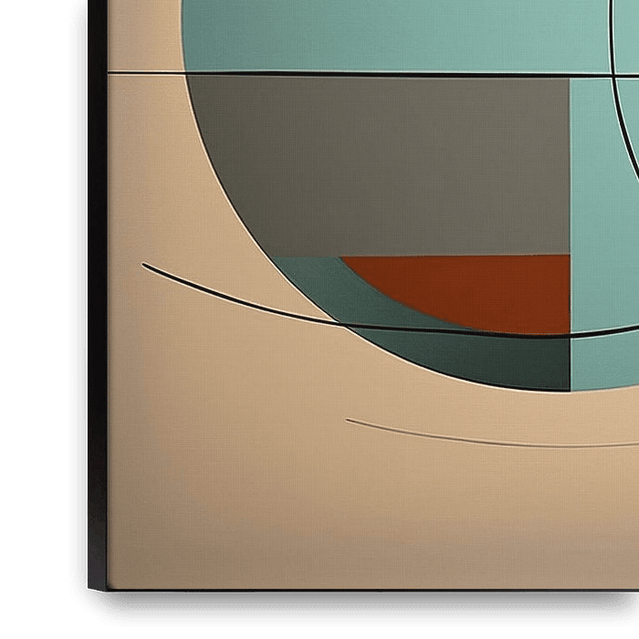 Geometrisches Farbspiel | Moderne Geometrie - Dieses Gemälde zeigt ein Spiel mit geometrischen Formen, bei dem sich Kreise und Linien in einer ruhigen, ausgewogenen Komposition überschneiden. Die Farbpalette ist mit Terra-, Schwarz- und Blaugrüntönen zurückhaltend und vermittelt ein modernes, minimalistisches Gefühl.