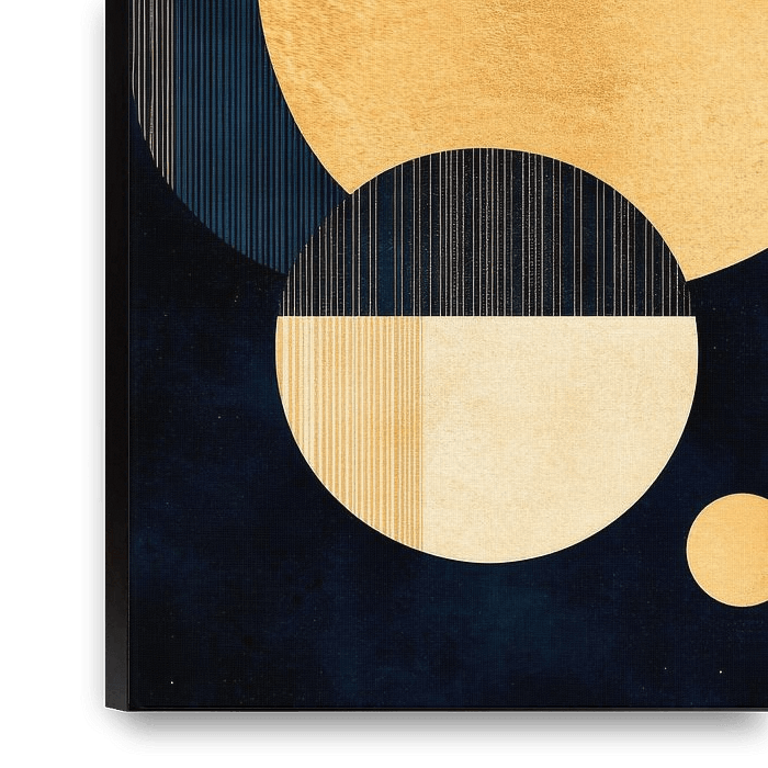 Mit leuchtenden goldenen Kreisen, die elegant über einem tiefblauen Hintergrund schweben, strahlt dieses Kunstwerk eine zeitlose Harmonie aus. Die Kombination aus geometrischen Formen und unterschiedlichen Texturen verleiht ihm eine moderne Note. Perfekt für ein stilvolles Wohnzimmer, schafft es eine Atmosphäre der Ruhe und Inspiration.