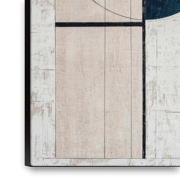 Geometrische Harmonien verschmelzen in einem faszinierenden Spiel aus klaren Linien und kräftigen Farben. Die sanften Kontraste von Dunkelblau und hellem Beige verleihen dem Raum eine moderne Eleganz. Ideal für das Wohnzimmer, schafft dieses Kunstwerk eine einladende Atmosphäre, die zum Verweilen einlädt und anregende Gespräche fördert.