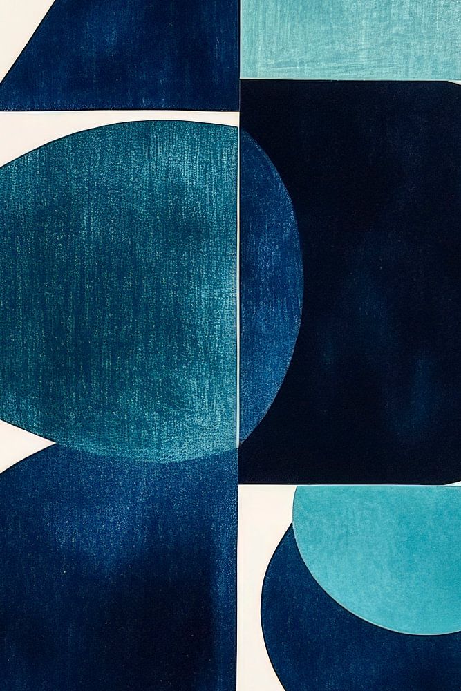 Schwebende Geometrie in tiefen Blautönen schafft eine harmonische Balance aus Form und Farbe. Die sanften Rundungen und klaren Linien verleihen dem Raum eine moderne Note. Diese Kunst wirkt besonders einladend im Wohnzimmer, wo sie Gespräche anregt und gleichzeitig eine beruhigende Atmosphäre schafft. Ein wahrer Blickfang für kreative Köpfe!