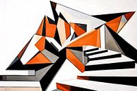 Dieses Kunstwerk ist ein faszinierendes Beispiel für geometrisch-abstrakte Kunst. Es verwendet klare Linien, scharfe Winkel und ein kräftiges Farbschema aus Orange, Schwarz und Grau. Die Figuren scheinen sich zu drehen und die Perspektive zu wechseln, was dem Werk einen dynamischen Charakter verleiht. Die Treppenformen führen den…