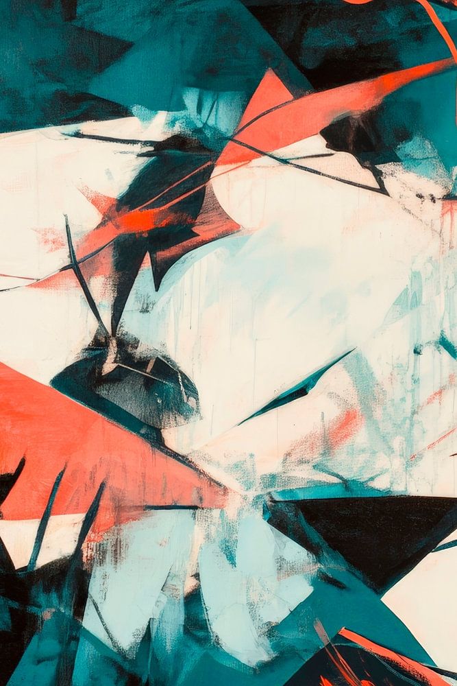 In einem faszinierenden Tanz aus kräftigen, geometrischen Formen entfalten sich lebendige Farben, die eine pulsierende Energie ausstrahlen. Die Kombination aus tiefem Anthrazit, strahlendem Türkis und leidenschaftlichem Rot erzeugt ein beeindruckendes Zusammenspiel, ideal für ein modernes Wohnzimmer, das Kreativität und Dynamik ausstrahlen möchte.