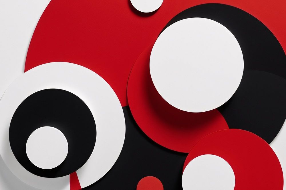 Dieses moderne Design kombiniert klare Linien und geometrische Formen mit einem kräftigen Farbschema aus Rot, Schwarz und Weiß. Die verschiedenen Schichten von Kreisen und Formen verleihen ihm einen dynamischen und dreidimensionalen Effekt und machen es zu einem perfekten Kunstwerk für moderne Innenräume. Der lebhafte Kontrast zwischen den Farben zieht die Aufmerksamkeit auf sich und verleiht jedem Raum einen Hauch von Energie. Dieses Kunstwerk würde perfekt in ein modernes Büro oder ein elegantes Wohnzimmer passen, wo es die Aufmerksamkeit auf sich zieht und als stilvoller Blickfang fungiert. Ideal für Liebhaber von abstrakter Kunst und minimalistischem Design.