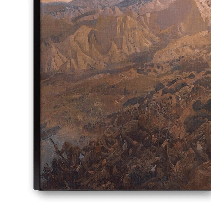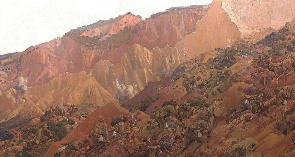Eines der ikonischen Gemälde in der Sammlung der Gedenkstätte. Lambert stützte sich bei der Komposition auf mehrere Quellen: Ölskizzen des Geländes, die er während der Gallipoli-Mission im Jahr 1919 anfertigte, Skizzen aus dem Atelier und Fakten über die Landung, die er von Veteranen und Bean erhielt. Wichtige Aspekte der Landung, wie die Ankunft der Australier am Strand in der unteren linken Ecke, ihr Kampf durch das Gestrüpp und ihr Aufstieg die steilen Hänge hinauf, sind in das Bild eingeflossen. Die Komposition zeigt die Weite der Landschaft, das unwirtliche Terrain und die Kleinheit der Männer in ihr. Es sind tote und fallende Soldaten zu sehen, und im Hintergrund steigt Rauch vom Artilleriefeuer auf. Das Panorama der Landung ist komprimiert und verzerrt, um eine bildliche Erzählung eines entscheidenden Ereignisses darzustellen.