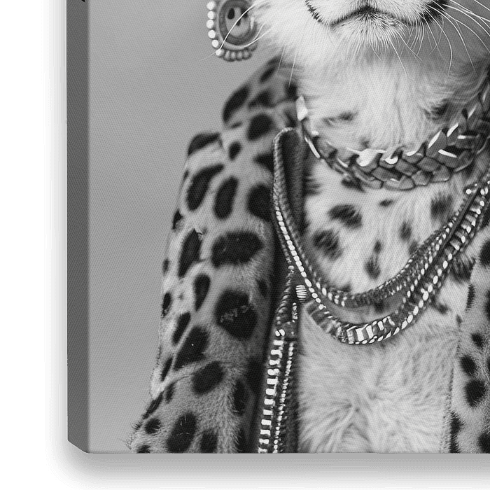 Schwarz-weiß Foto eines Geparden mit Sonnenbrille, Leopardenmuster Hut und Jacke. Stilvolle und ausdrucksstarke Tierfotografie.