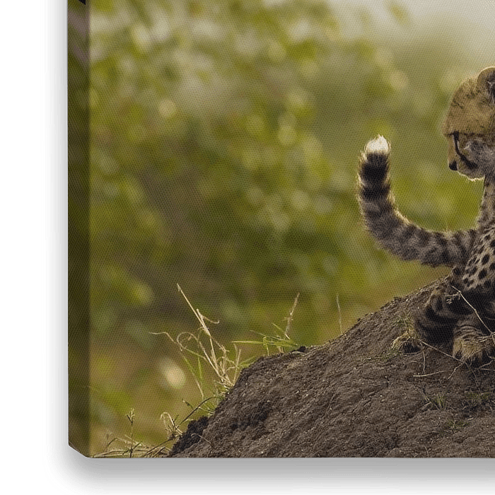 Mutter-Gepard (Acinonyx-jubatus) mit sechs Jungen auf dem Ausblick auf einem Licht des Termitenhügels im frühen Morgen, Maasi Mara National Reserve, Kenia. © Albie Venter / Natur auf Lager