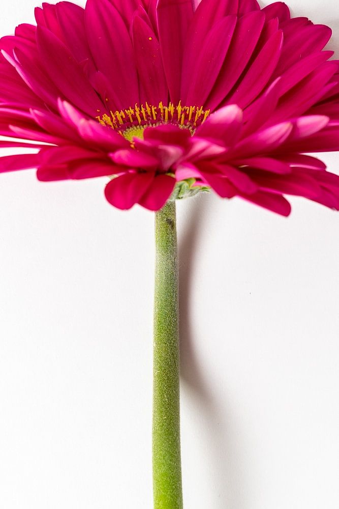 Dieses Bild zeigt eine rosafarbene Gerbera vor einem weißen Hintergrund. Die Gerbera ist eine beliebte Zierblume, die für ihren großen Blütenkopf und ihre leuchtenden Farben bekannt ist. In diesem Bild steht die Blüte im Mittelpunkt und lenkt die Aufmerksamkeit direkt auf ihre leuchtend rosa Blütenblätter. Die Blütenblätter sind symmetrisch in mehreren Reihen angeordnet und verleihen der Blüte ein volles und harmonisches Aussehen.