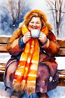 Bestelle dieses Porträt Gesellige Dame trinkt auf einer Bank von De gezellige Dames als Reproduktion auf Leinwand, Alu-Dibond, als Poster, Fototapete oder Acrylglasbild.