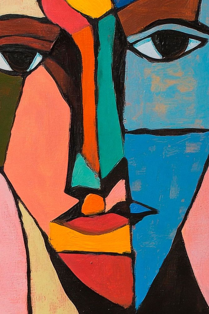 Eine spannende Fusion aus geometrischen Formen entfaltet sich hier. Bunte, kantige Flächen kreieren ein faszinierendes Gesicht, während der rosa Hintergrund eine verträumte Atmosphäre schafft. Die kontrastierenden Farben und scharfen Linien verleihen dem Porträt eine lebendige Dynamik, die die Sinne anspricht und den Betrachter zum Nachdenken anregt.