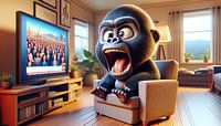 Das zweite Bild zeigt den gleichen animierten Gorilla, diesmal jedoch in einem gemütlichen Wohnzimmer, während er fasziniert die Nachrichten auf einem großen Flachbildfernseher verfolgt. Seine Mundhaltung spiegelt Schock oder Überraschung wider, vielleicht aufgrund der Nachrichteninhalte. Das Wohnzimmer ist warm und einladend, mit einer…