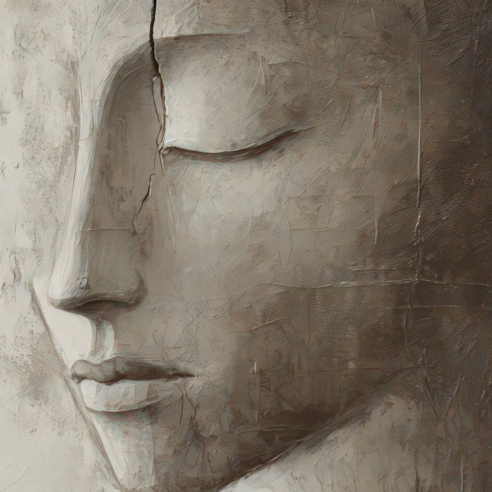 Ein Porträt, bei dem die Textur der Leinwand einen rissigen Effekt erzeugt, der an verfallene Kunstwerke und antike Skulpturen erinnert. Dieses Werk strahlt eine heitere Melancholie aus, wobei subtile Erdtöne die Sanftheit betonen.