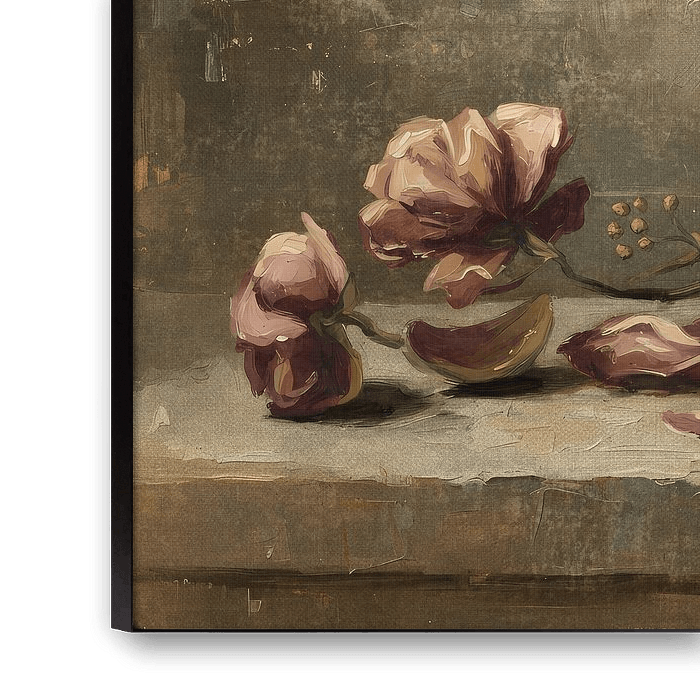 Eine umgestürzte Goldvase mit Rosen auf einem Steinsockel. Ein Kunstwerk mit vielen warmen Tönen und Textur, ausgeführt in einem klassischen Stil.