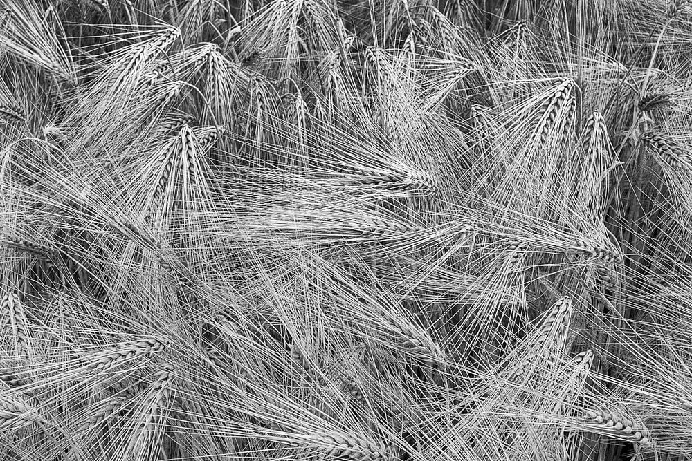 Ein Detail eines großen Gerstenfeldes. Die Gerste ist recht einfach an den langen Haaren an den Ohren zu erkennen.