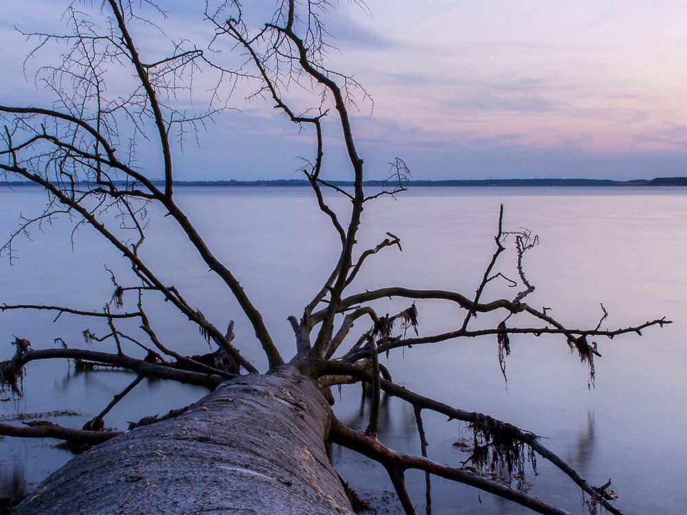 Op deze mysterieuze foto is een gevallen boom te zien die door het zoute zeewater een verbeeldend object is geworden. Locatie is de Oostzee in Denemarken