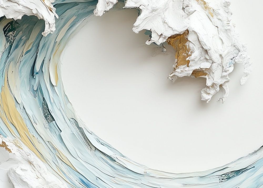 Eine abstrakte weiße Welle aus strukturiertem Papier mit freiliegenden Kanten und fließenden, eleganten Linien in der Mitte. Das Ganze ist mit Ölfarbe in Schichten von Blau, Beige und dezentem Gold vor einem warmen, cremefarbenen Hintergrund aufgebaut. Die Komposition strahlt Raffinesse und Stille aus und fängt die Bewegung des Wassers in einer fast greifbaren Form ein. Ein außergewöhnliches Kunstwerk, das sowohl Kraft als auch Ruhe ausstrahlt. Perfekt für ein modernes, helles Interieur mit einer heiteren Atmosphäre.