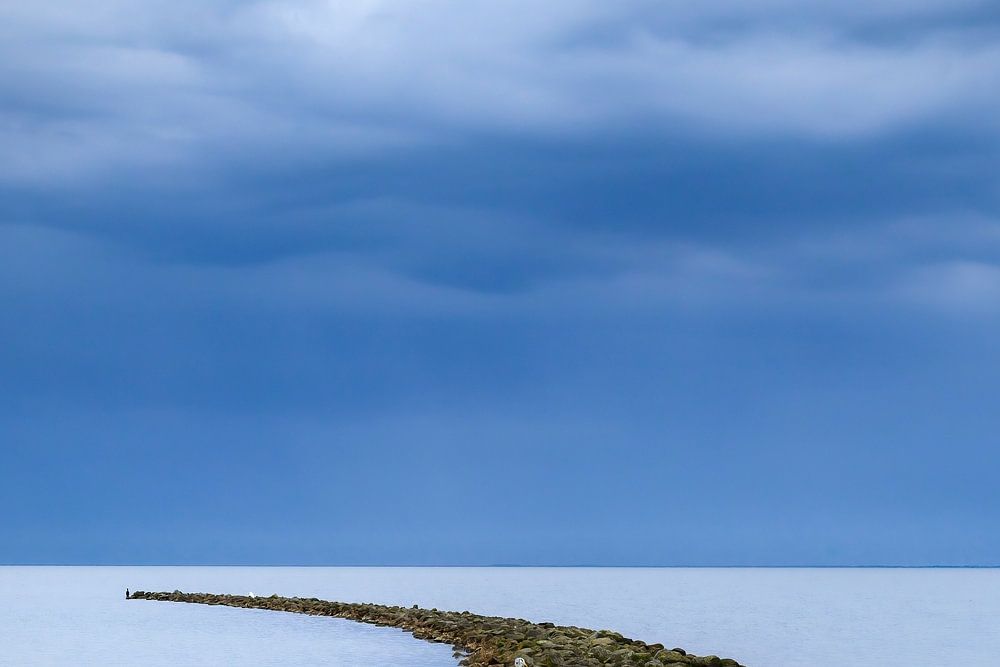 Gewitterwolken über einem Damm im IJsselmeer an einem Frühlingstag am IJsselmeerufer.