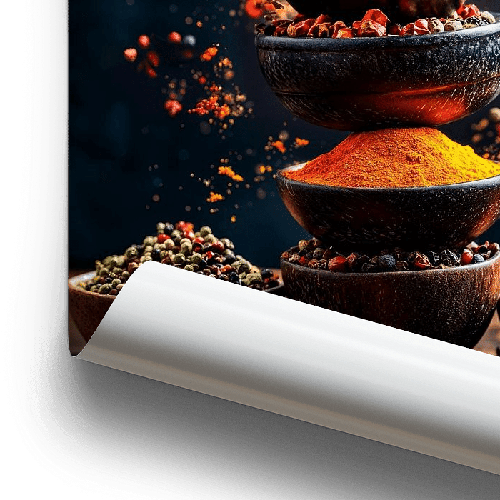 Ein farbenfrohes Spektakel der Gewürze entfaltet sich, mit goldenen Kurkuma-Höhen und rotem Paprika, die im Kontrast zu erdigen Tönen schillern. Zarte Zimtstangen und aromatische Lorbeerblätter scheinen in der Luft zu tanzen. Ideal für die Küche, lädt dieses lebendige Kunstwerk dazu ein, die Sinne anzuregen und kulinarische Abenteuer zu…