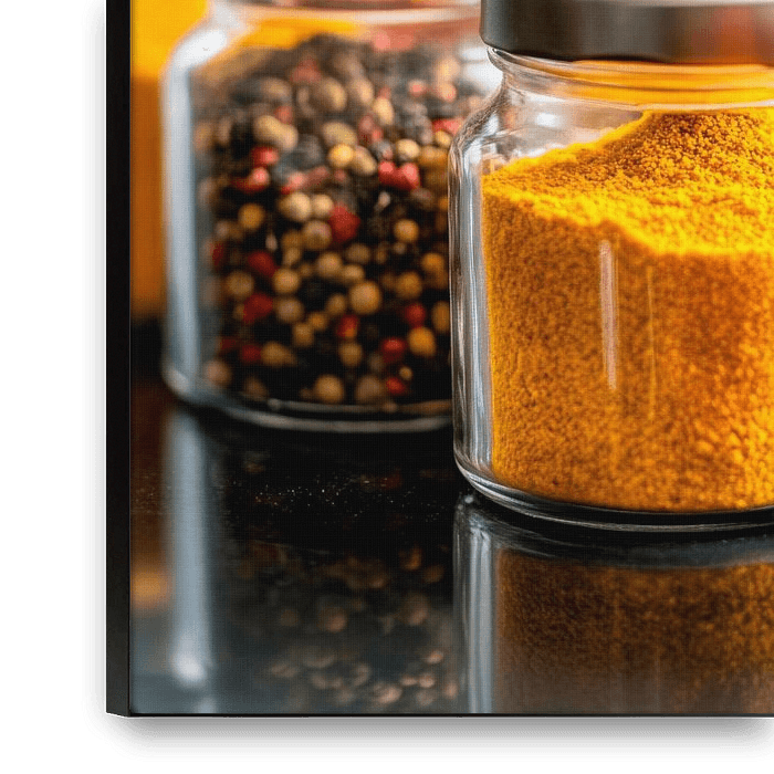In einer harmonischen Anordnung leuchten die bunten Gewürze in glasklaren Behältern um die Wette und laden zum Experimentieren ein. Der goldene Schein des Curcumas mischt sich mit dem tiefen Schwarz der Pfefferkörner – ein Fest für die Sinne. Dieses Kunstwerk eignet sich perfekt für die Küche, wo Kreativität und Geschmack…