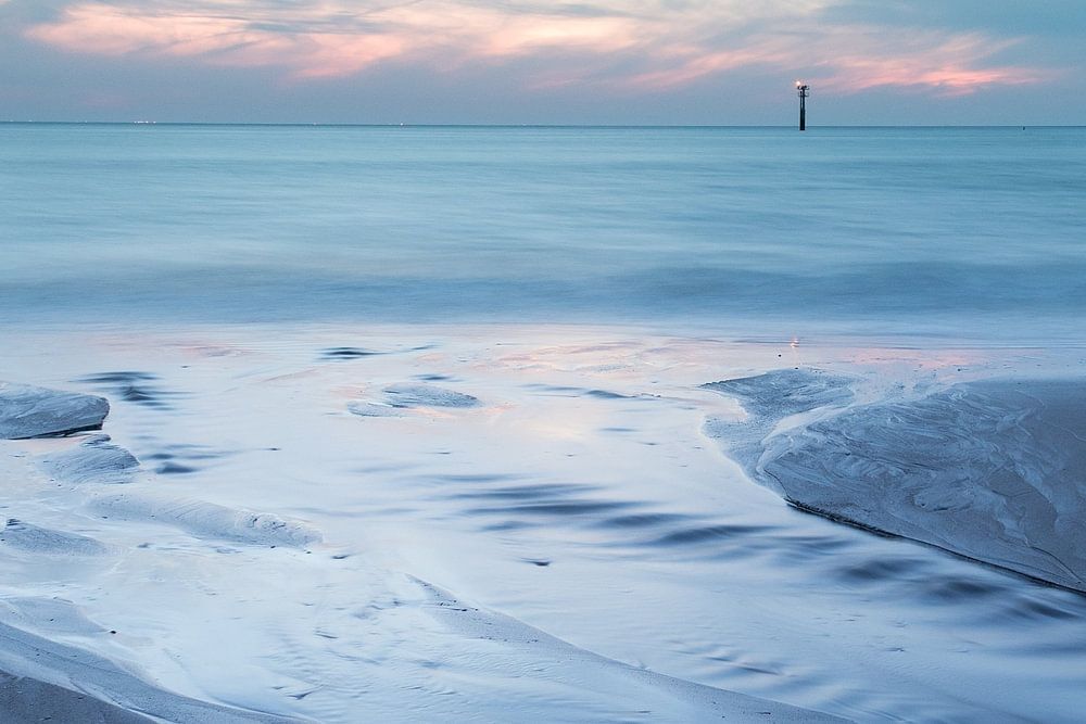 Am Strand von Haamstede gibt es neben den bekannten Wellenbrechern auch Gezeitenkanäle. Dieses Foto wurde kurz nach Sonnenuntergang während der sogenannten "blauen Stunde" aufgenommen. Die Reflexion des Himmels färbt das Meer hellblau. Die längere Belichtungszeit sorgt für eine glatte See, in der die Wellen noch zu sehen sind. In der Ferne leuchtet ein einzelnes Leuchtfeuer.