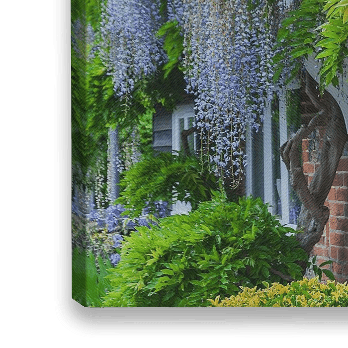 Ich habe diese Fassade mit Glyzinienbüscheln in den Cotswolds in England fotografiert. Charakteristische niedrige Landhäuser mit roten Backsteinmauern, die mit Kletterpflanzen bewachsen sind.