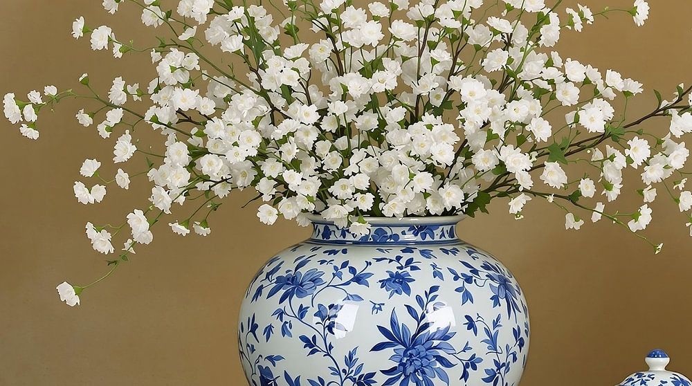 Diese Komposition ist ideal für Liebhaber einer stilvollen Inneneinrichtung und für Sammler traditioneller Keramiken. Ob in einem modernen oder klassischen Raum platziert, dieses Stück verleiht sofort Raffinesse und ein Gefühl der Ruhe. Dieses Bild eignet sich hervorragend als Inspiration für florales Styling, Innenarchitektur oder als Marketingmaterial für Unternehmen, die dekorative Kunst und Blumenarrangements anbieten.