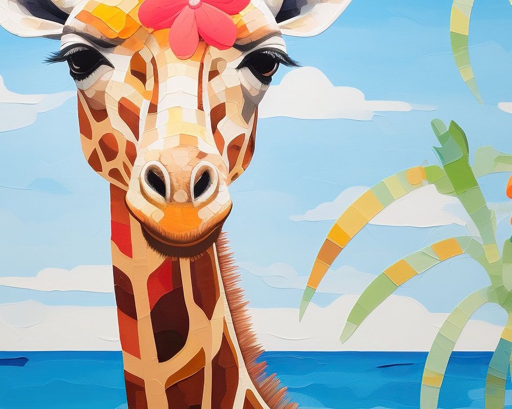 Giraffe Colours | Giraffe Tropical Flowers - Das Bild zeigt eine fröhliche Giraffe mit einer Blume hinter dem Ohr vor einem Hintergrund aus blauem Himmel und tropischen Blumen. Der Stil ist lebhaft und verspielt, mit einer starken Farbpalette, die ein Gefühl von Freude und Leichtigkeit vermittelt.