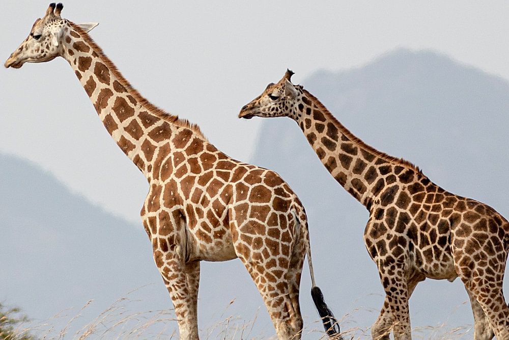 Diese Aufnahme von Giraffen im Kidepo Valley National Park in Uganda wurde während einer Safari gemacht. Die Landschaft ist eine hügelige Savanne, in der es viele Büffel und Giraffen gibt. In der Ferne sind immer wieder Hügel zu sehen, die eine perfekte Kulisse bilden.