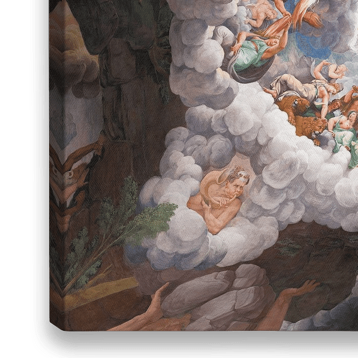 Auf eigentümliche, aber kohärente Weise endet der Himmel hinter der Jupitermarkise wie ein Gewölbe. Der Himmel ist geschlossen, in einer Weise, die charakteristisch für die Kunst von Giulio Romano ist, der eine erfundene Realität mit einem künstlichen Raum verbindet. Die zwölf Säulen, fast von einer Wolke verdeckt, tragen den imaginären…