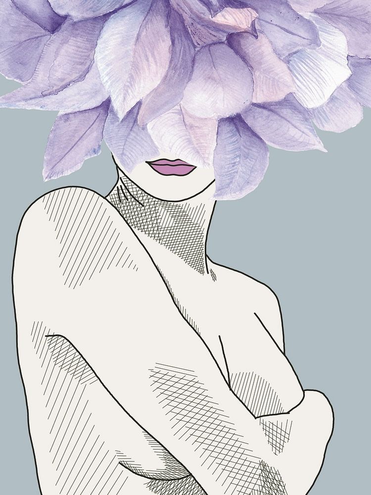"Glacial Allure" ist ein emotionaler Widerspruch, der in Tusche und Aquarell festgehalten wurde. Auf den ersten Blick sieht man eine minimalistische, nackte Figur: ruhig, gelassen, fast statuarisch. Doch oberhalb der Schultern erblüht ein surrealer Schwall von Blütenblättern - überdimensioniert, zart, geschichtet in scharfen Lavendel- und Silberblautönen. Ihr Gesicht ist völlig verdeckt, was Anonymität oder innere Ruhe suggeriert, aber die schiere Größe der Blume macht es unmöglich, ihre Präsenz zu ignorieren.