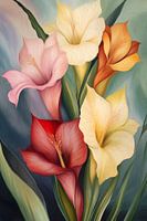 Ein farbenfrohes Arrangement aus Gladiolenblüten in verschiedenen Farben, darunter Rot, Rosa und Gelb. Die üppigen grünen Blätter ergänzen die leuchtenden Blüten auf wunderschöne Weise.