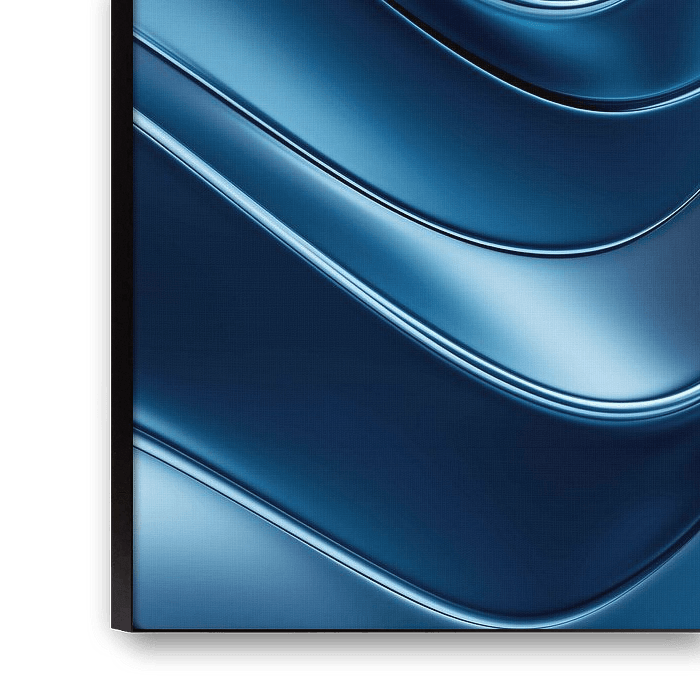 Das Bild zeigt eine abstrakte Darstellung sanfter, geschwungener Wellen in glänzendem Blau. Die harmonischen Linien und Reflexionen verleihen dem Motiv eine elegante, futuristische Ästhetik.