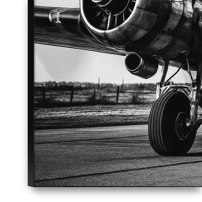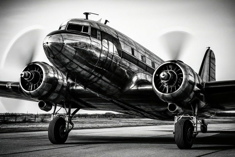 Ein glänzendes klassisches Propellerflugzeug schwebt tief über der Landebahn, mit drehenden Propellern und klaren Nietlinien, die das Metall zum Glänzen bringen. Die Schwarz-Weiß-Palette betont den Kontrast zwischen dem spiegelnden Rumpf und dem weichen, verschwommenen Hintergrund. Die Nase mit Lufteinlässen und symmetrischen Motoren…