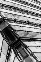 Das Kunstwerk zeigt eine Nahaufnahme einer modernen Glasfassade am Potsdamer Platz in Berlin. Die Struktur besteht aus großflächigen Glasplatten, die von einem präzise konstruierten Metallrahmen gehalten werden. Die geometrische Anordnung der Elemente erzeugt ein spannungsreiches Muster, das durch die Spiegelungen von Himmel und Wolken…